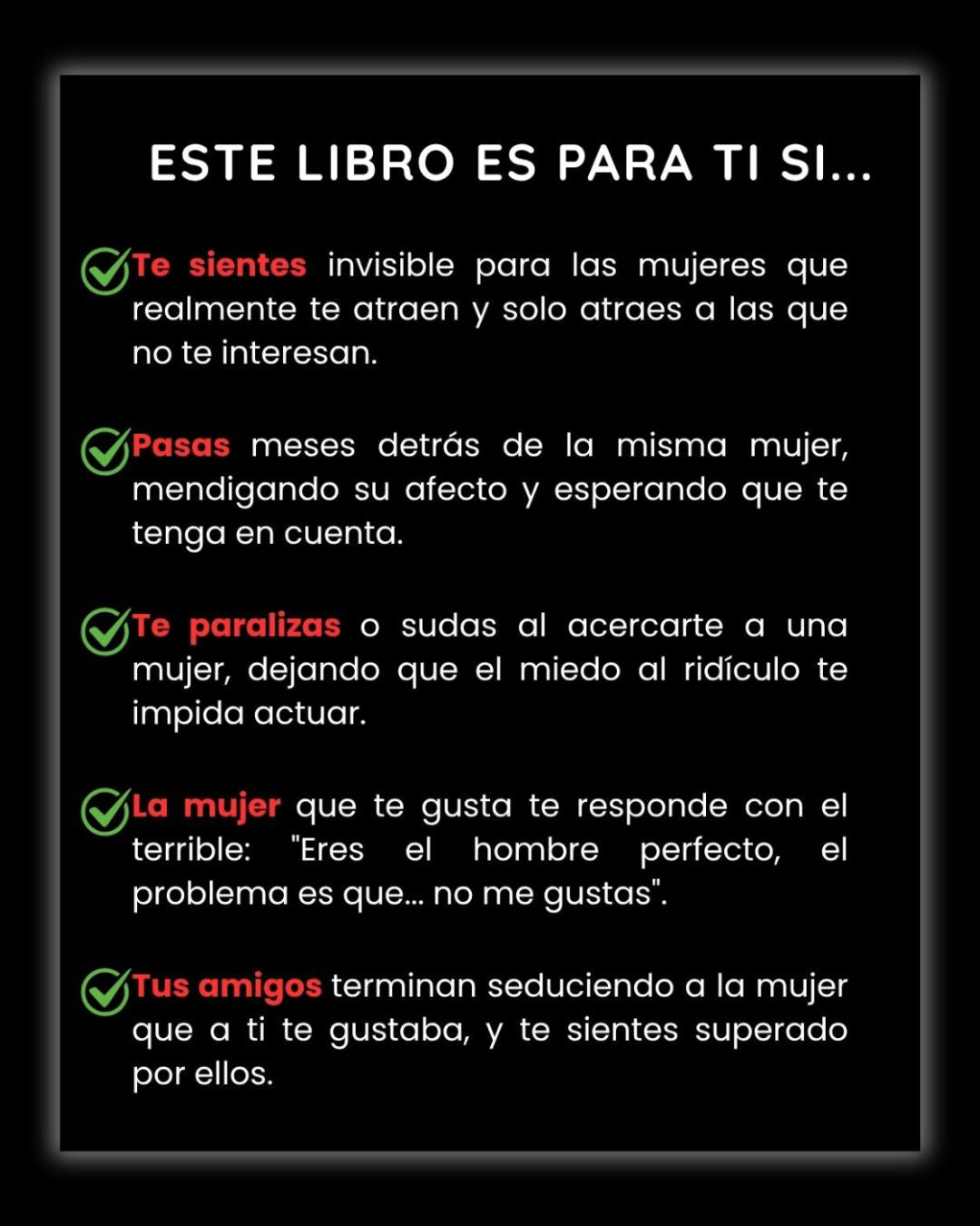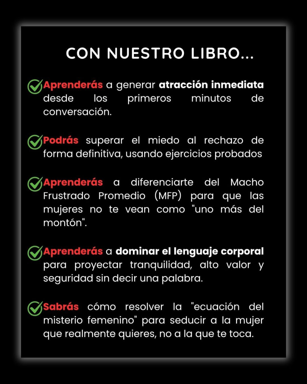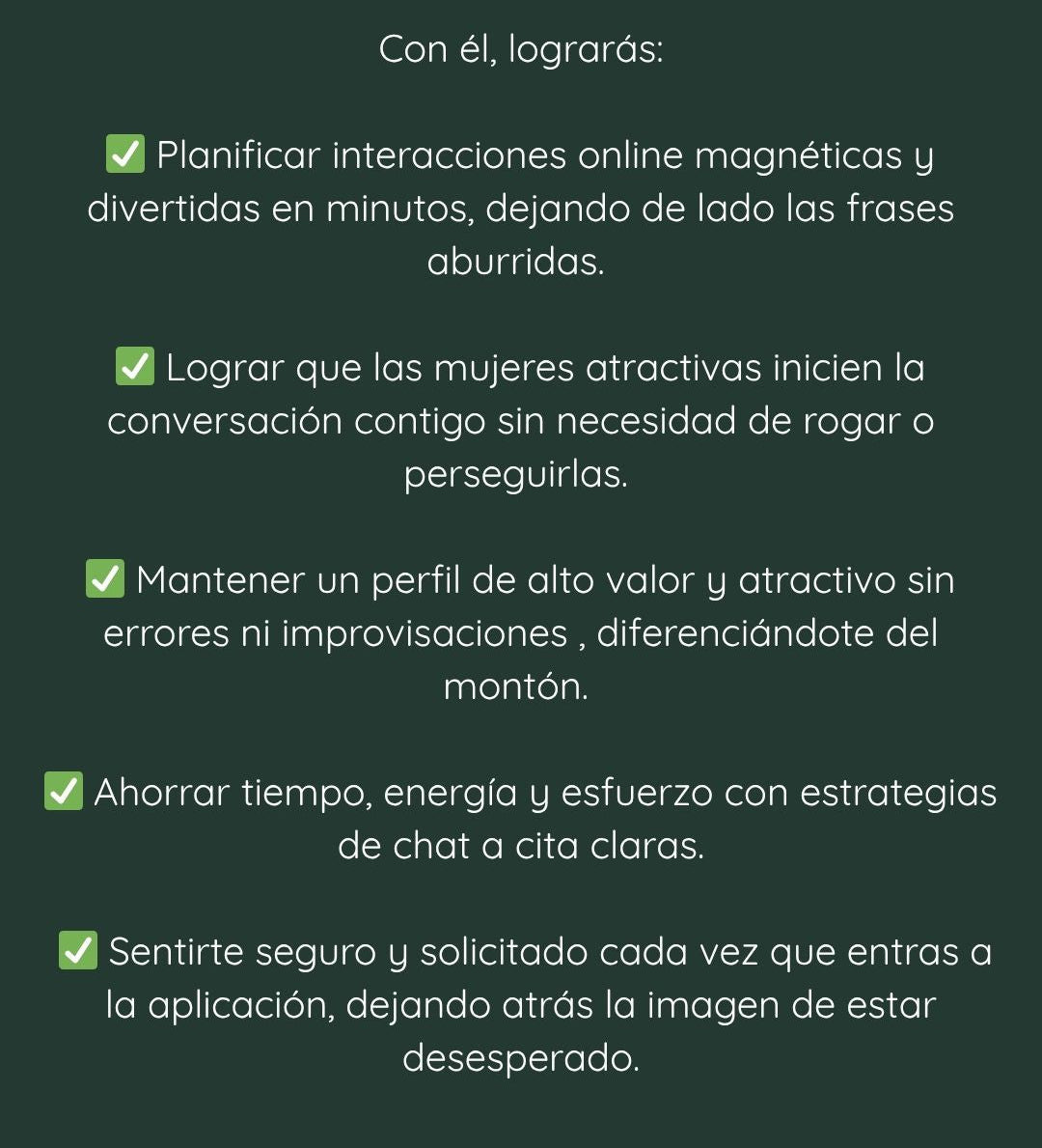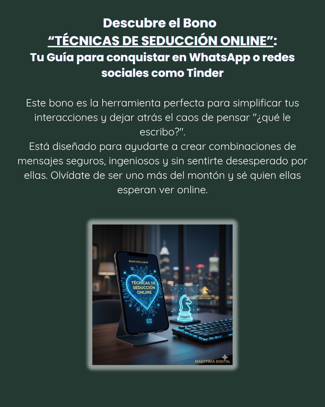 Absolutamente. Este paquete incluye el bono exclusivo "Técnicas de Seducción Online", que te enseña a manejar tus perfiles de Tinder e Instagram como una "carta de presentación" de alto valor. Aprenderás a pasar del chat a la cita sin perder tiempo en mensajes irrelevantes.